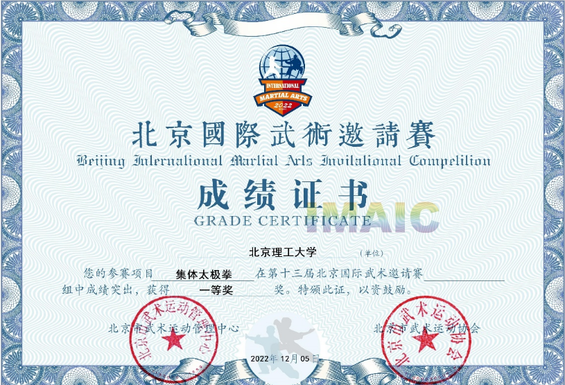 2022年9月26日-11月30日,第十三届北京国际武术邀请赛在线上举办,北京理工大学太极拳协会11名教职工组队参赛。经过近两个月的集训,北京理工大学队在220支“太极拳集体项目”队伍中脱颖而出,荣获太极拳集体一等奖,在66支获得一等奖的队伍中排名第4名。