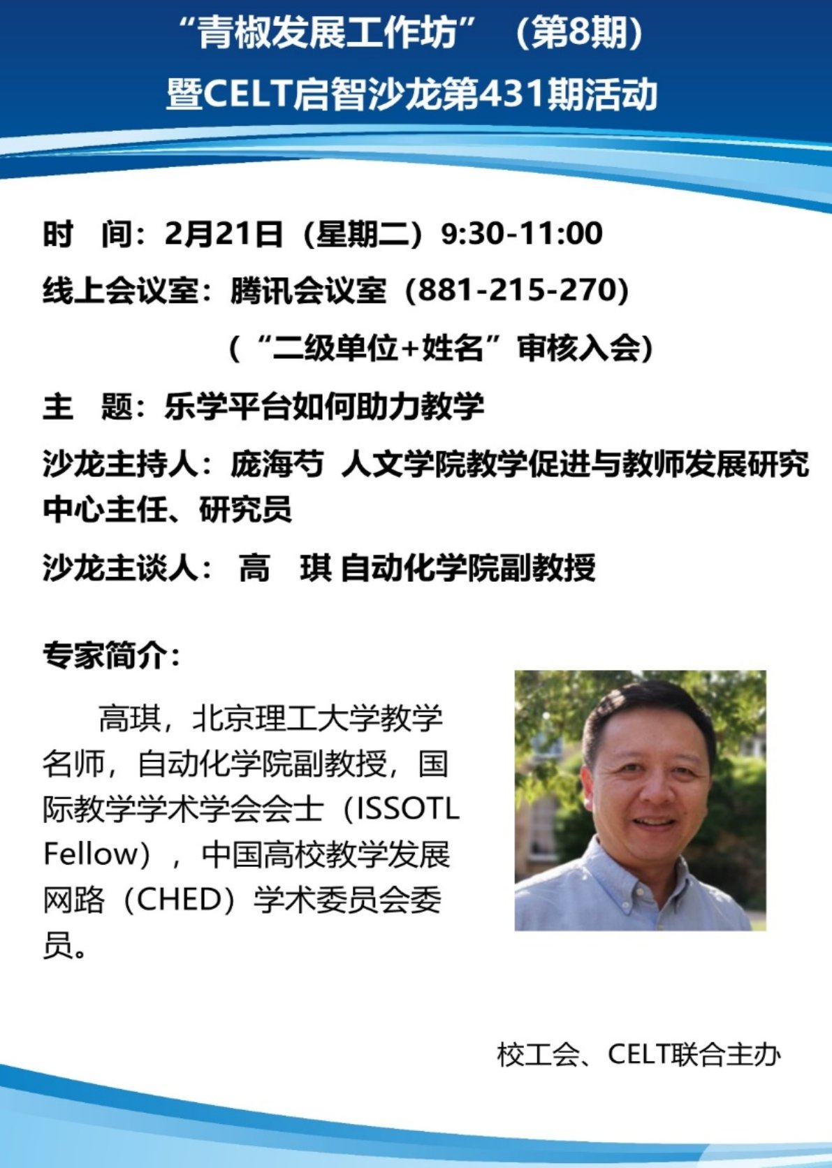 2月21日,校工会与人文学院教学促进与教师发展研究中心(CELT)联合举办第八期青椒发展工作坊。自动化学院高琪副教授作“乐学平台如何助力教学”沙龙活动。来自机械学院、设计学院、人文学院、网络中心等20余名师生在线参加了学习,培训由人文学院教学促进与教师发展研究中心主任庞海芍研究员主持。